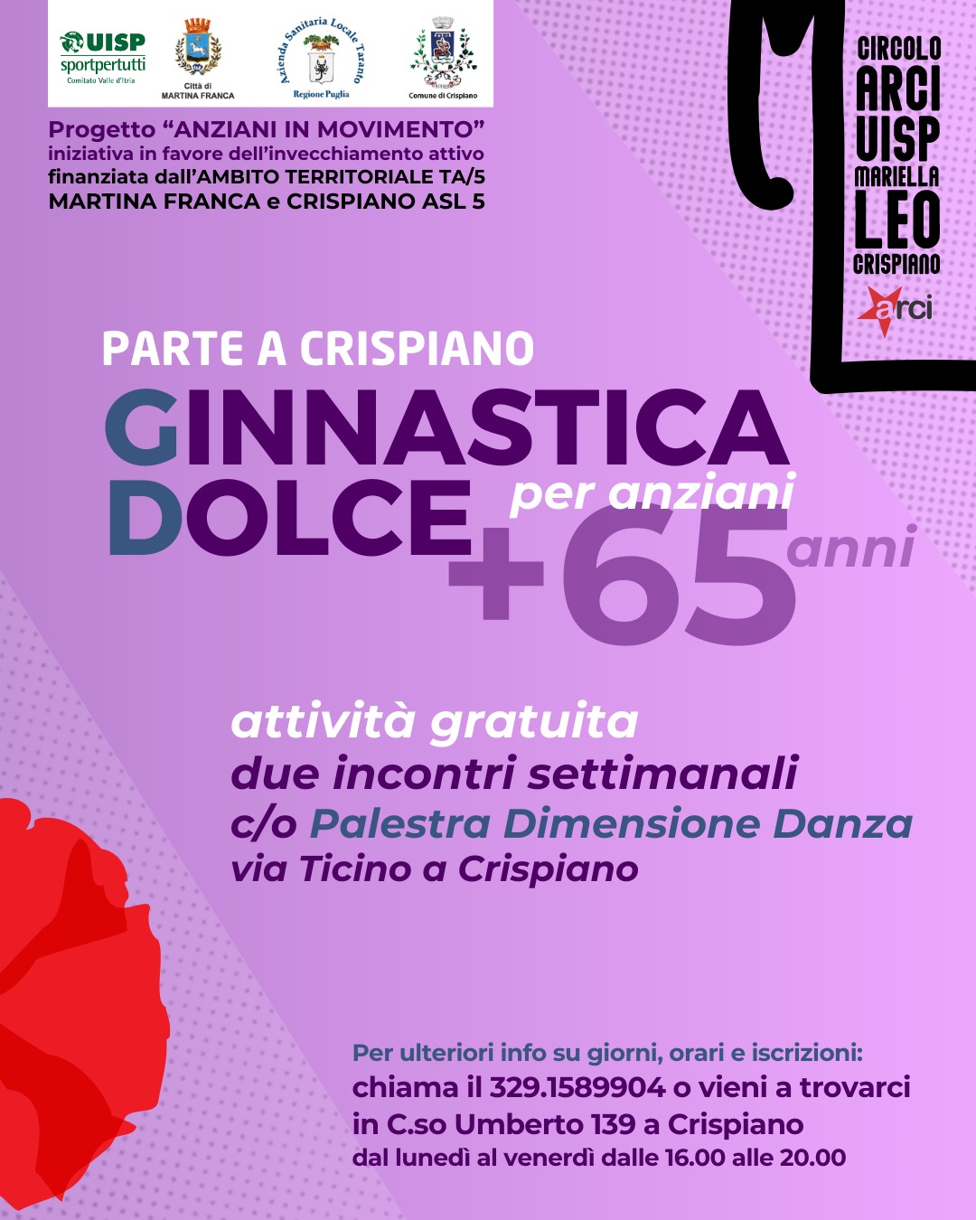 Nello specifico l’attività di ginnastica dolce, gestita dal Circolo Arci-Uisp Crispiano, completamente gratuita, salvo l’assicurazione infortuni, consiste in due incontri settimanali che si svolgeranno nella palestra dell’ASD Dimensione Danza in Via Ticino n.10 che ha messo a disposizione la propria sede.
