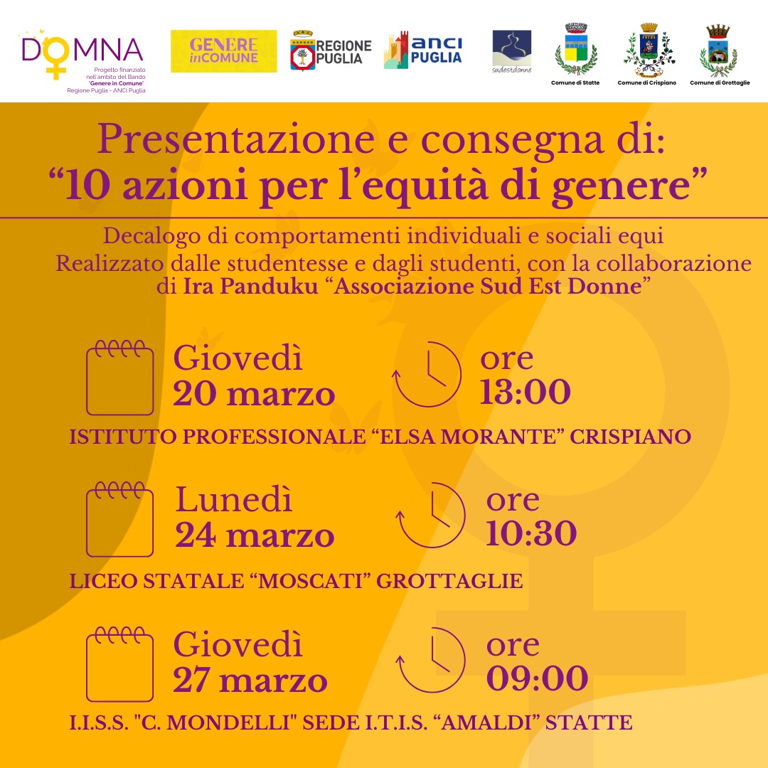 Come noto, il Comune di Crispiano, in collaborazione con il Comune di Statte e il Comune di Grottaglie ha partecipato con successo all’Avviso pubblico denominato “GENEREinCOMUNE” bandito dall’ ANCI Puglia e finalizzato all’attuazione della parità di genere in Comuni pilota.