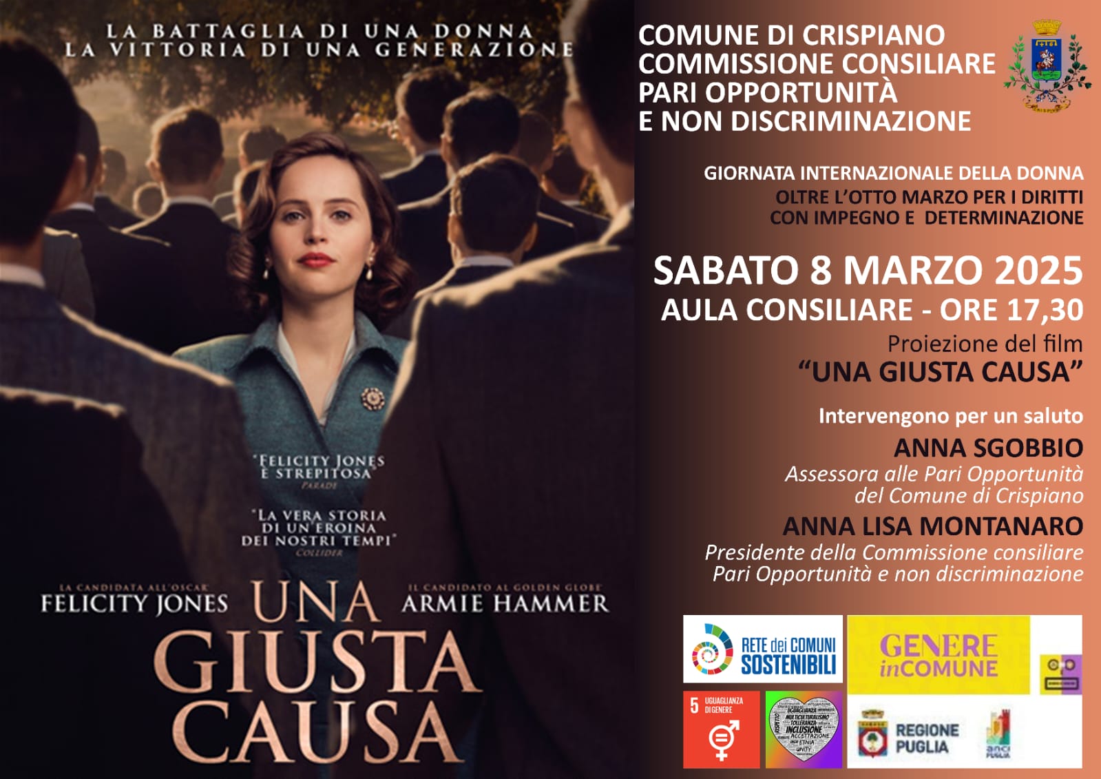 Il prossimo sabato 8 marzo, in occasione della Giornata Internazionale della donna, è prevista la proiezione del film “Una giusta causa” nella sala consiliare del Comune di Crispiano, in piazza Madonna della Neve 3.