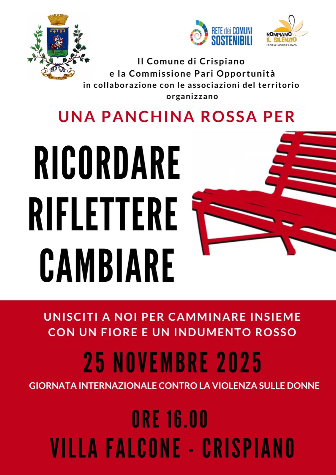 “Una panchina rossa per ricordare, riflettere, cambiare” questo è il titolo dell’iniziativa promossa dalla Commissione Pari Opportunità e non discriminazione del Comune di Crispiano, in collaborazione con le associazioni del territorio.