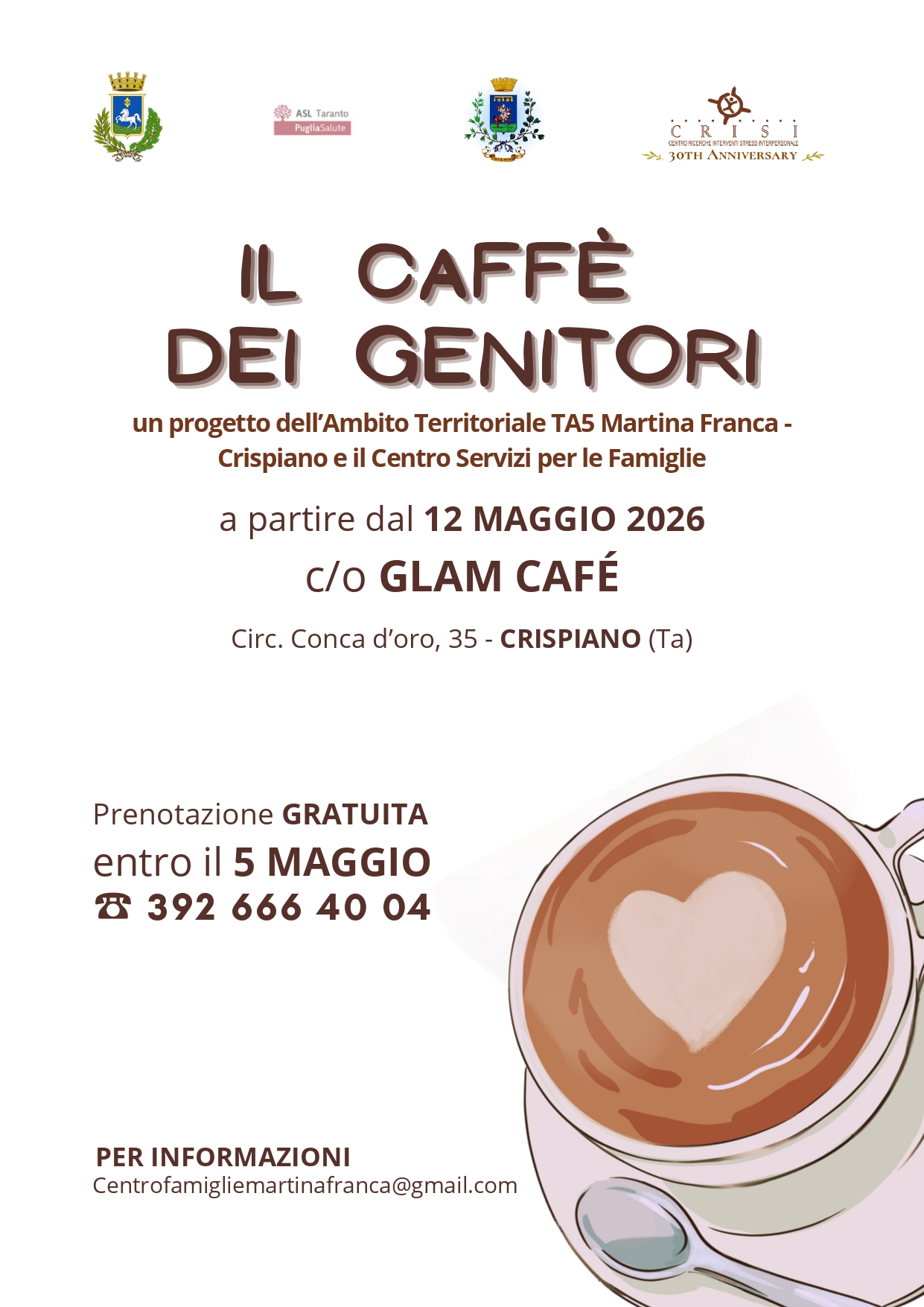 Il primo caffè insieme sarà martedì 12 maggio dalle 16.30 alle 17.30 al Glam Cafè (circ. Conca D'oro n 35 di Crispiano)