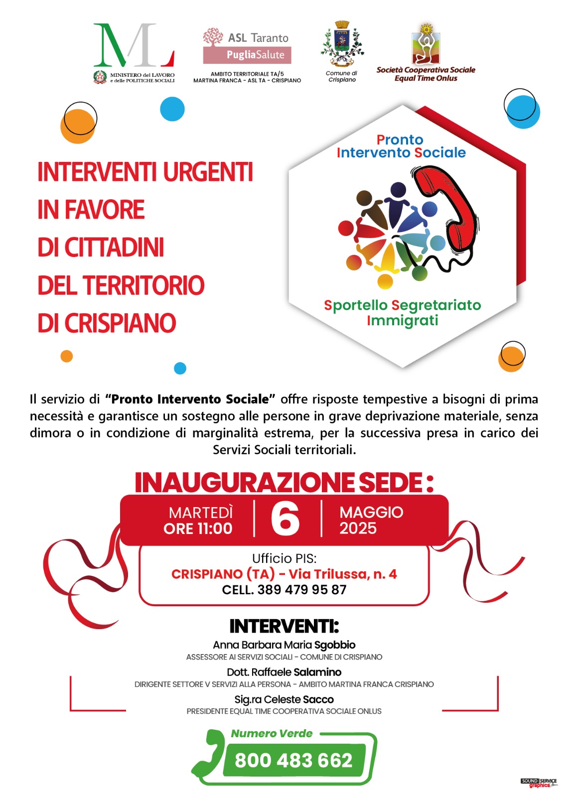Martedì 6 maggio, alle ore 11.00, si svolgerà l’inaugurazione della sede di Crispiano del Pronto Intervento Sociale.