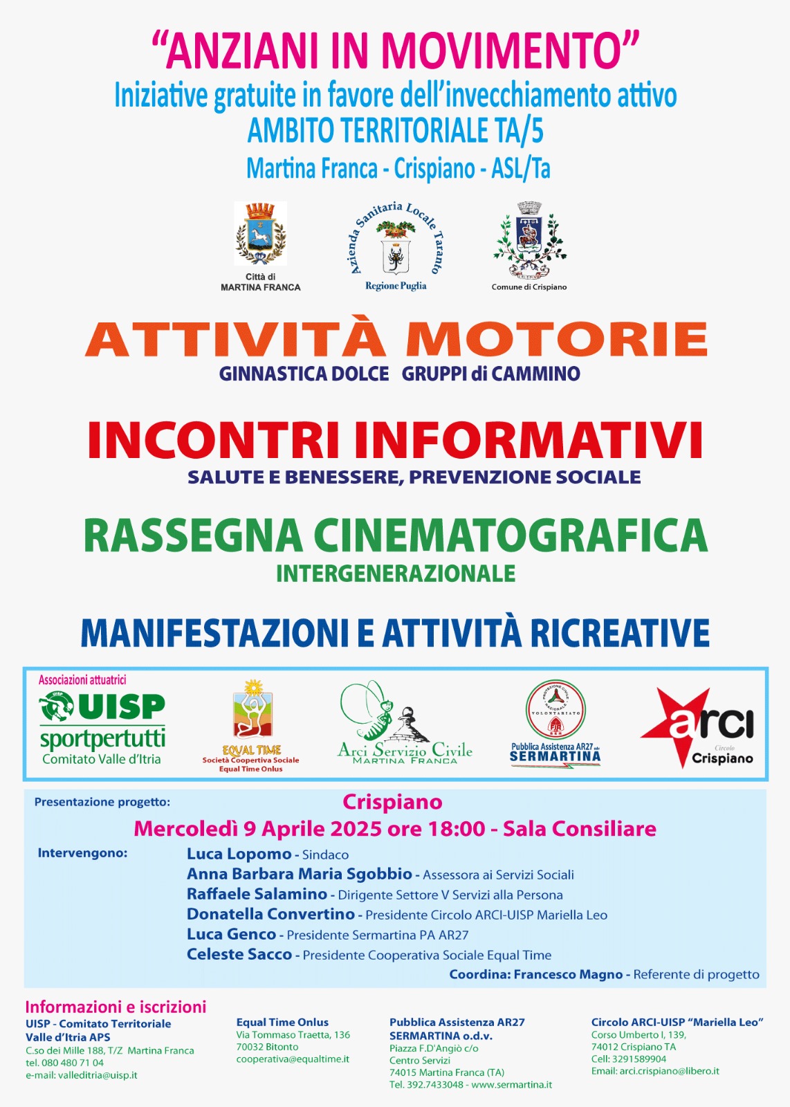 Il progetto “ANZIANI IN MOVIMENTO” ha come capofila il Comitato UISP Valle d’Itria Martina Franca, insieme al Circolo ARCI-UISP Crispiano “Mariella Leo”, alla Cooperativa Sociale Equal Time ed alla Odv Pubblica Assistenza Ar27, ed è stato selezionato grazie a un avviso di co-progettazione emanato dall’Ambito Territoriale Martina Franca – Crispiano per soggetti del Terzo Settore.